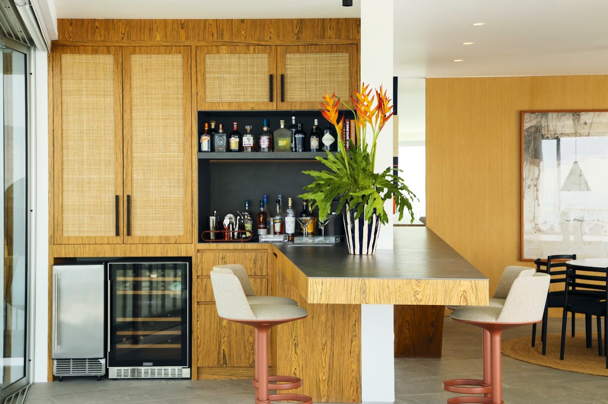 El diseño busca que la barra tenga presencia sin recargar el ambiente. Por eso, la licorería y el menaje se mantienen discretamente ocultos dentro de un mueble revestido en madera con paneles de fibras naturales.