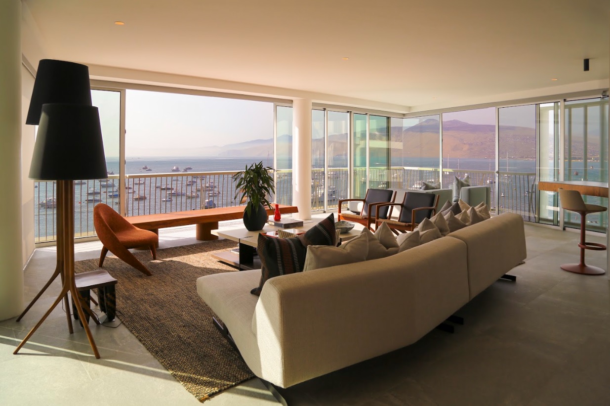 La sala principal se abre completamente hacia la bahía de Ancón. Los grandes ventanales permiten que la vista y la luz natural definan la experiencia del espacio.