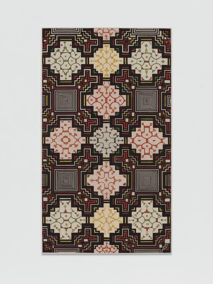 En la exhibición, Flores presenta representaciones conceptuales del conocimiento ancestral shipibo-konibo: mapeos del cosmos, relatos amazónicos y símbolos de su cosmovisión, visibles en las superficies pintadas. El título ‘Bakish Mai’, también el nombre de la escuela que cofundó en la Amazonía peruana, se traduce como “Tierra de Ayer y Mañana” y alude a una concepción circular del tiempo, en la que los pasados ancestrales moldean el futuro y las epistemologías indígenas siguen resonando en la política de la tierra y la vida.