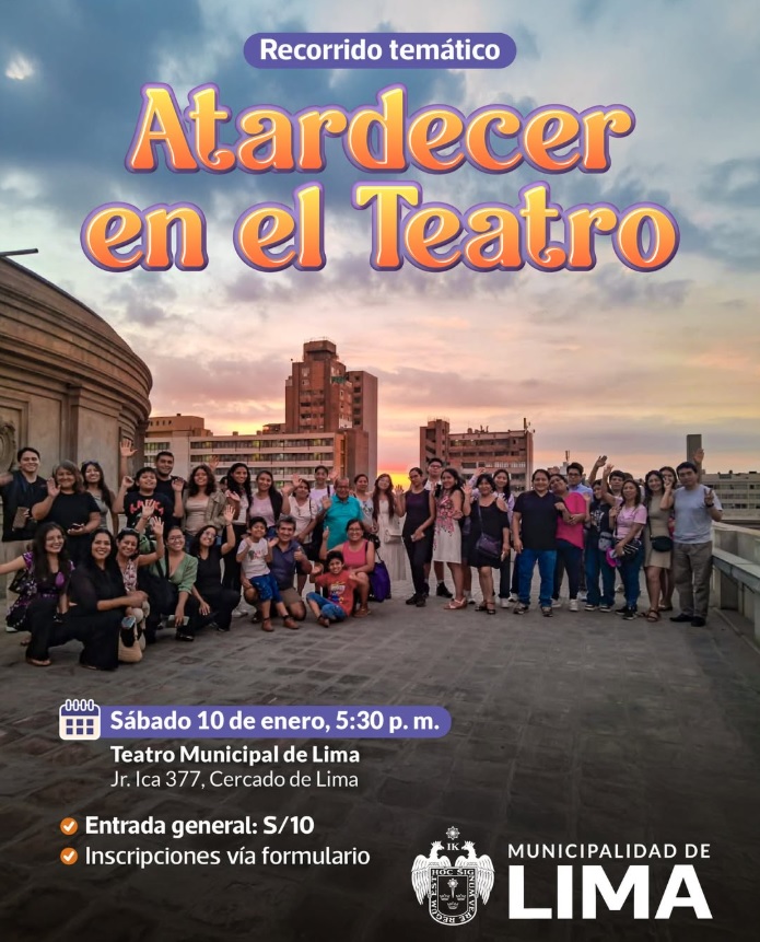 Este sábado por la tarde puedes vivir una experiencia única con un recorrido guiado por el Teatro Municipal de Lima, uno de los espacios culturales más emblemáticos de la ciudad. Conocerás su escenario, palcos, platea y los rincones que se esconden tras sus muros históricos. El recorrido culmina con un momento especial: un atardecer desde la terraza del teatro, que ofrece una vista privilegiada del Centro Histórico y de la ciudad de Lima.