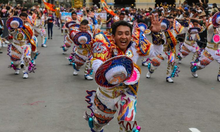 Agrupaciones folclóricas presentan danzas tradicionales como Morenada, Caporales y Diablada durante el pasacalle.