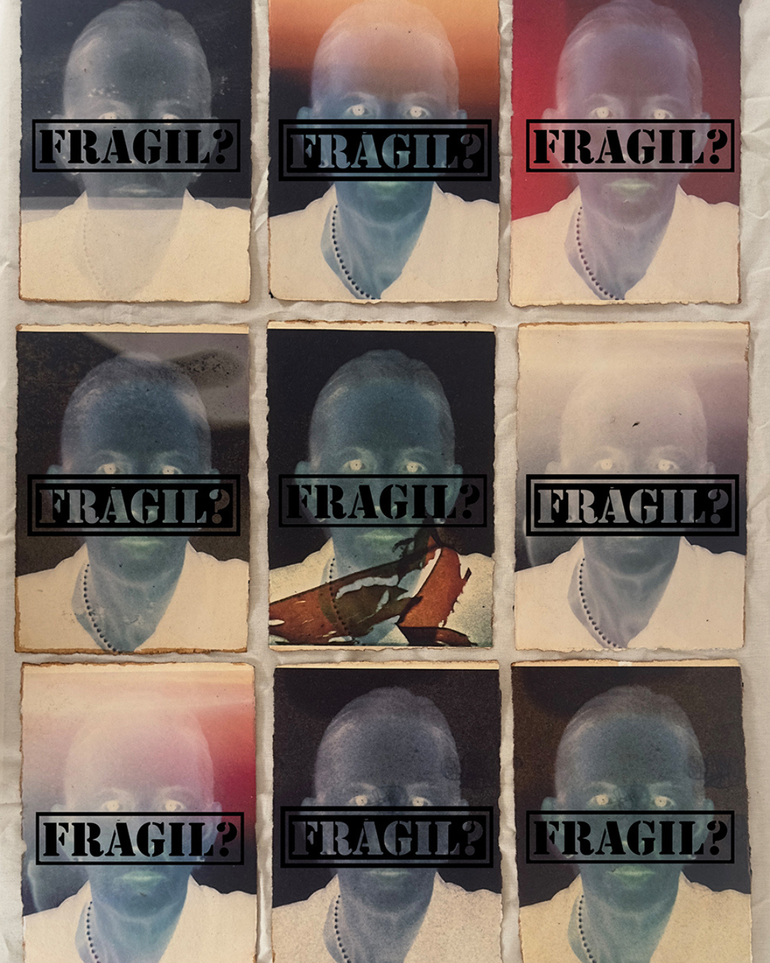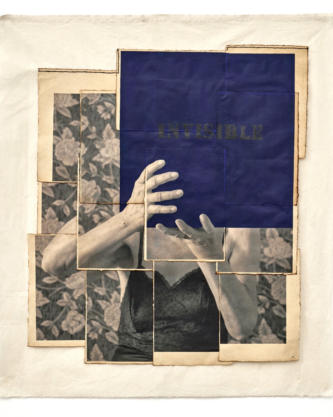 Una de las piezas es una fotografía de una mujer, y su rostro se tapa con un cuadro azul que dice ‘invisible’…