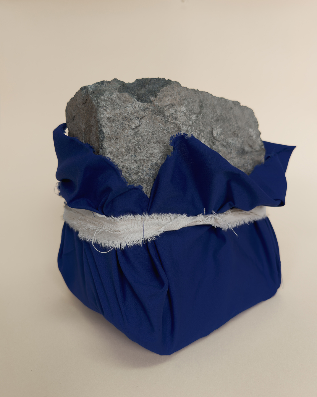 La piedra, en ese sentido, representa ese peso constante, silencioso, que se sostiene en el tiempo. Sin embargo, no está sola. Está envuelta en una tela azul, que también es significativa dentro del proyecto. Esa tela funciona como una extensión del cuidado mismo: es el gesto de cubrir, de proteger, de sostener.