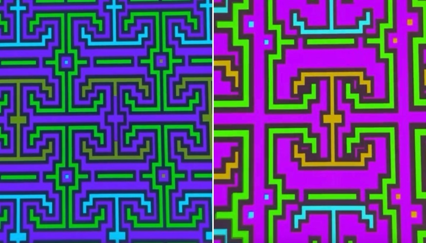 Detalle de obra de Olinda Silvano, donde el kené se despliega en patrones vibrantes que reinterpretan la memoria visual de la cultura amazónica