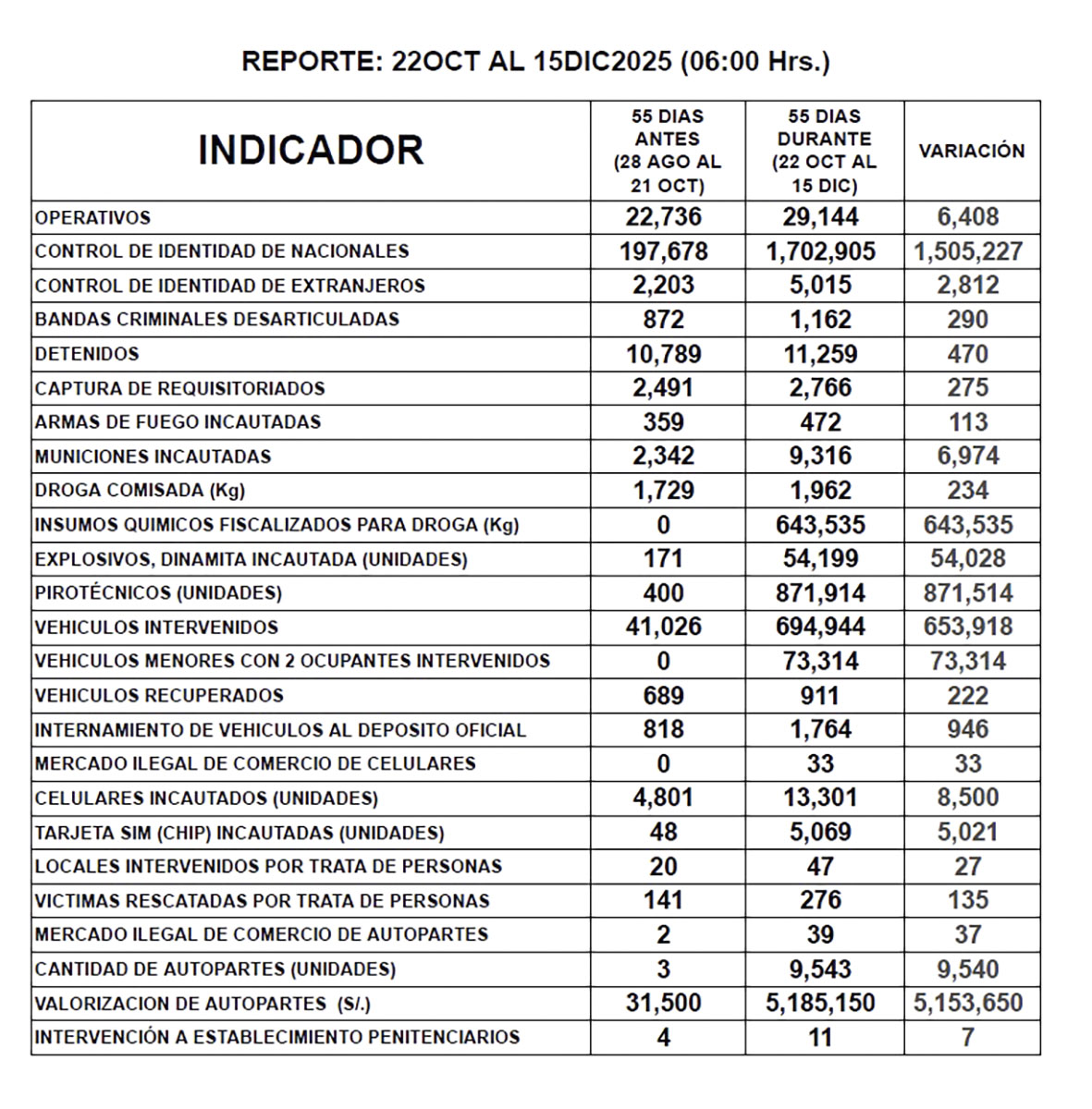 Reporte de la PNP, del 22 de octubre al 15 de diciembre.