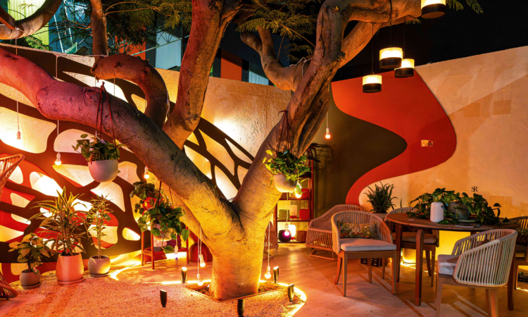 Cada elemento ha sido seleccionado para evocar serenidad: mobiliario de diseño con formas orgánicas, plantas y un concepto lumínico y lúdico que simula el brillo de las luciérnagas en la oscuridad. Presentamos una propuesta que trasciende lo estético, invitando a vivir la experiencia sensorial de un refugio en la selva, tu propio refugio personal para reconectar con lo esencial.