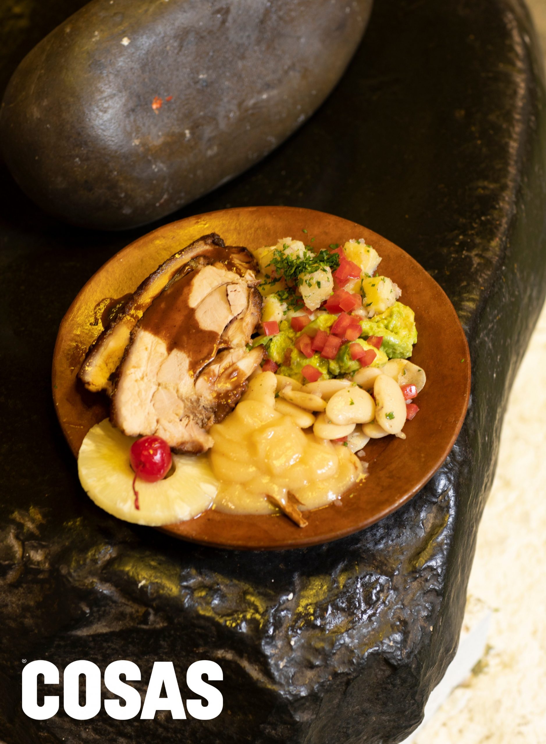 Lechón macerado en chicha de guiñapo y ensalada de pallares.