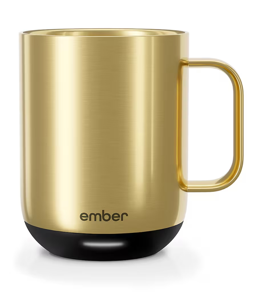 Taza inteligente de acero inoxidable con control preciso de temperatura vía smartphone. El posavasos-cargador mantiene la bebida caliente hasta 90 minutos, eliminando el café o té tibio.