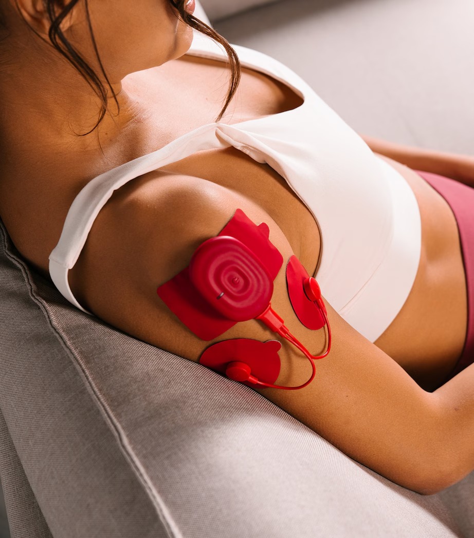 Estimulador muscular portátil con tecnología TENS para aliviar dolor temporal, acelerar recuperación y mejorar resistencia. Ligero y manos libres, se sincroniza con la app PowerDot para rutinas personalizadas.