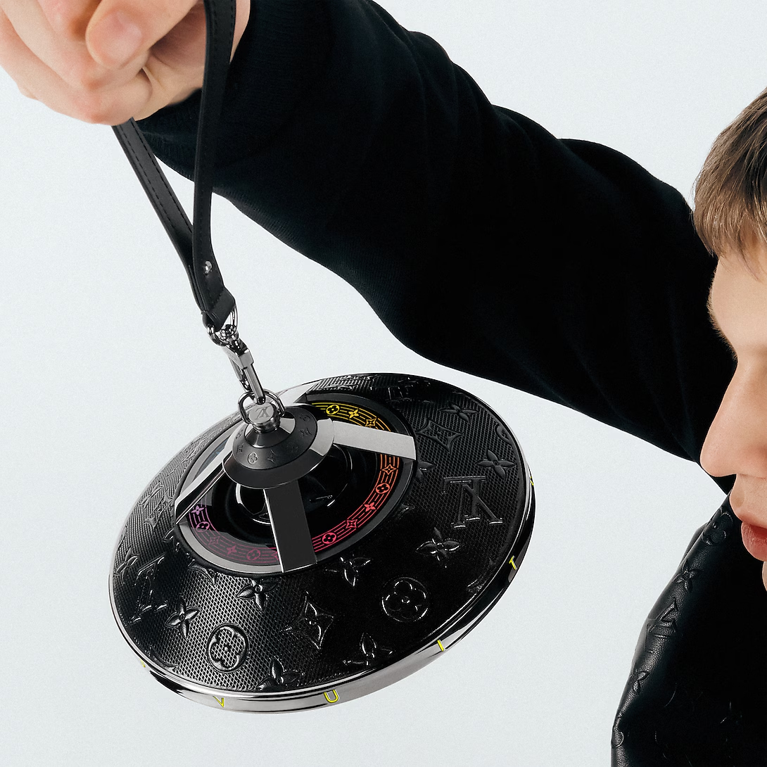 Inspirada en el bolso Toupie, parlante con conectividad inalámbrica y sonido de 360° de alta calidad. Es una pieza de arte elaborada en metal y piel noble, decorada con los detalles emblemáticos de la Maison.
