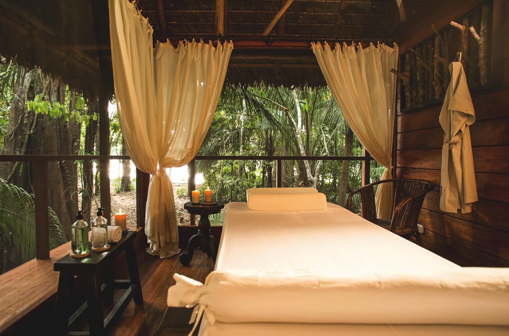 Concepto holístico amazónico que ofrece un servicio de exfoliación con cacao e ingredientes exóticos del bosque para reducir signos del envejecimiento y cicatrices en la piel. Contactarse con sales@inkaterra.com.