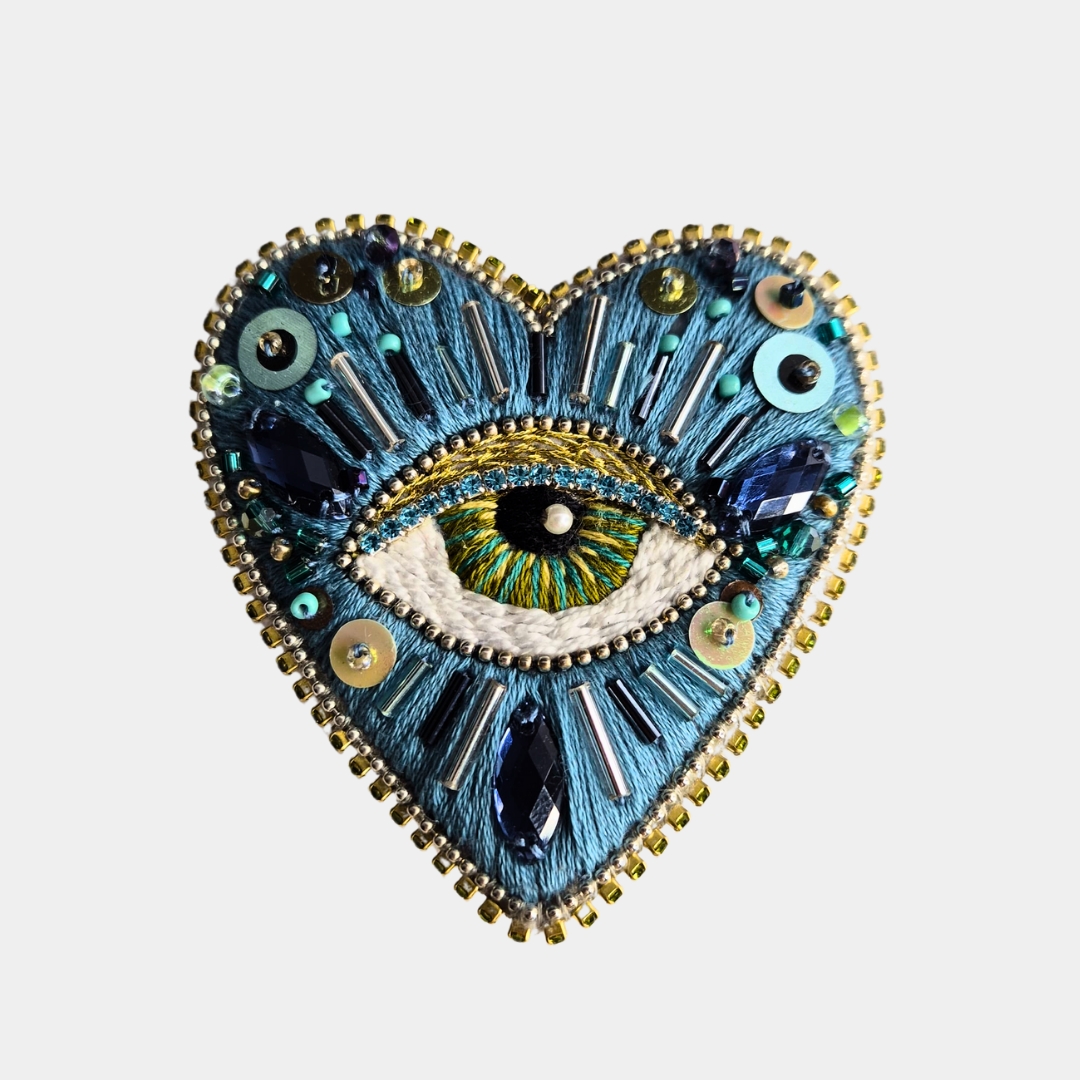 Broche con diseño de corazón y ojo turco azul, símbolo de protección, ideal para complementar looks. A pedido.