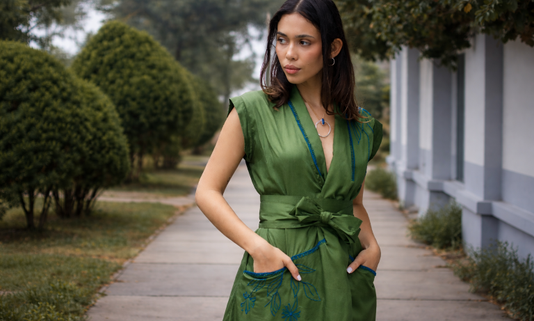 Vestido Quinde, confeccionado en algodón pima peruano y bordado 100% a mano.
