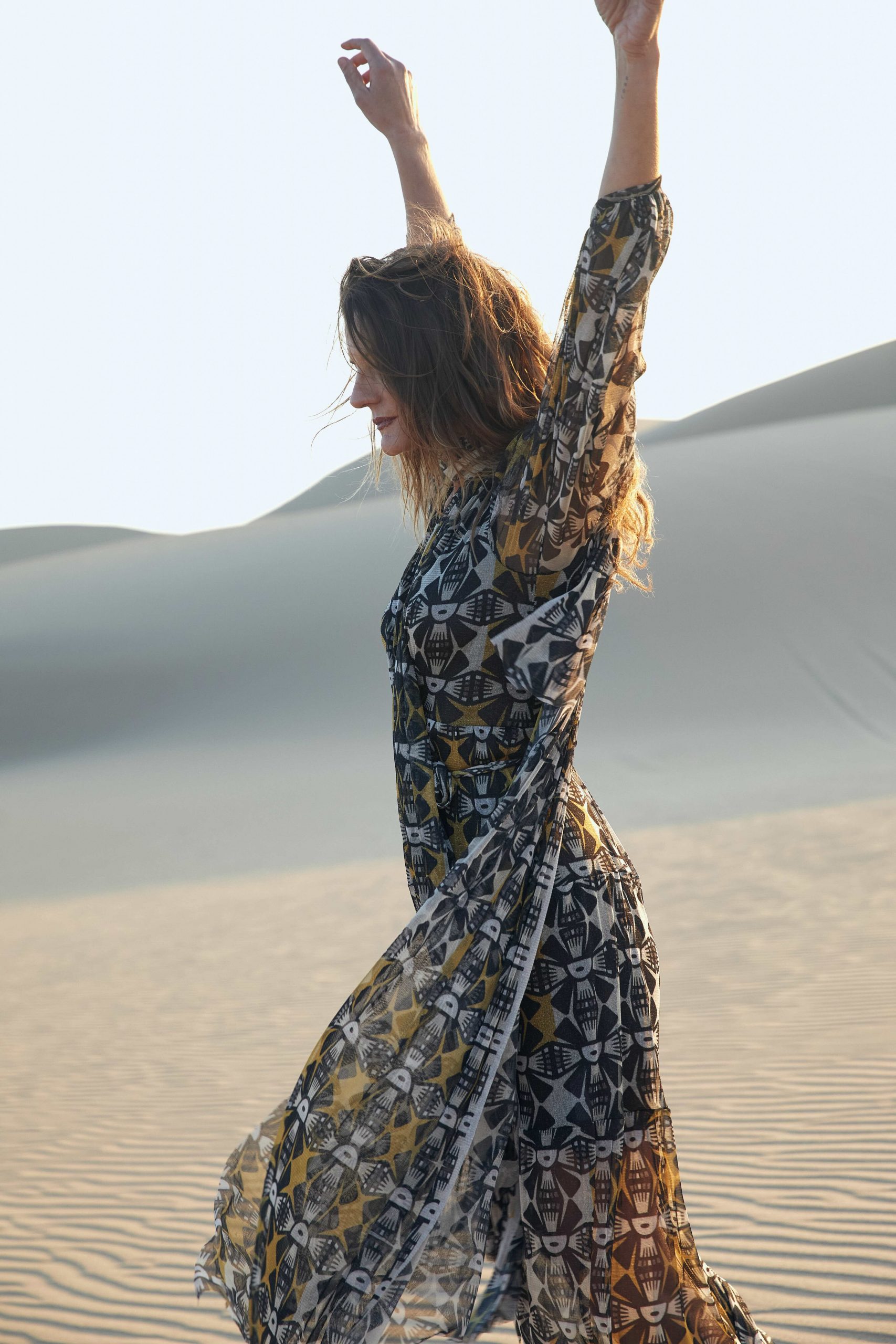 Tania Jelicic usando su prenda Paracas Inti Dress.
