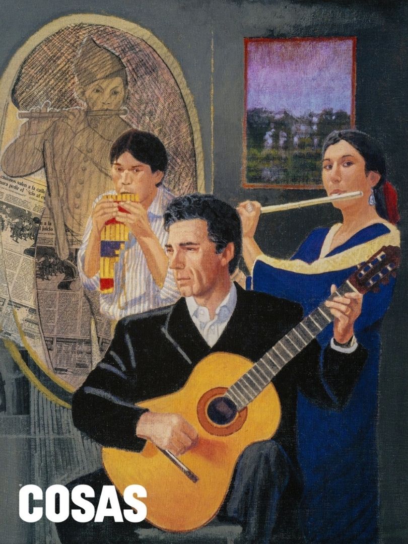 Al entrar en la casa de Javier Echecopar, noto muchas señales explícitas de música en cada rincón. Pinturas de Herman Braun-Vega donde aparece junto a su guitarra, partituras cuidadosamente ordenadas, un cuadro con notas de la iglesia de San Julián el Pobre en París y su libro “La música del Perú” me confirman su presencia. Entre los objetos más singulares destaca un retablo huamanguino incrustado dentro del cuerpo de una guitarra.