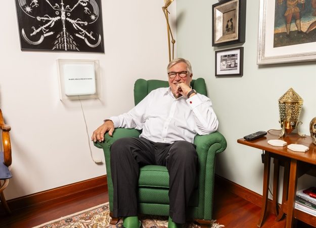 “Este es mi escritorio”, dice señalando la habitación donde pasa gran parte de su tiempo, leyendo novelas y teniendo conversaciones telefónicas en su sillón verde. En las paredes, cuadros, fotografías y esculturas conviven con un cierto orden narrativo. El espacio también revela su pasado como biólogo, una faceta poco conocida. “Me encanta la naturaleza. Por eso tengo este cráneo de tamaño natural en bronce”. El detalle no sorprende: hay una curiosidad científica que dialoga con su faceta de curador y exmartillero de arte del MALI.