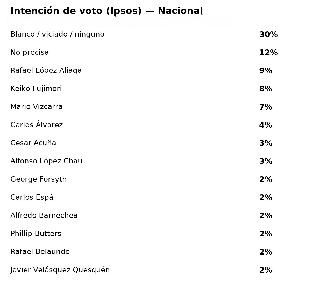 Encuesta nacional de Ipsos muestra que el voto en blanco, viciado o ninguno cayó de 39% a 30% en un mes. Rafael López Aliaga lidera con 9% y le siguen Keiko Fujimori y Mario Vizcarra.