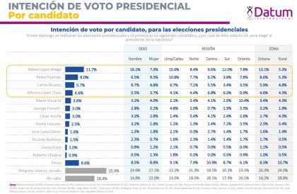 Sin embargo, cuando se desagrega por zonas del Perú, se observa claramente que López Aliaga cuenta con 12% en el sur. Es el segundo mayor respaldo electoral que el exalcalde de Lima recibe a nivel nacional, solo por detrás del 15,6% que obtiene en la capital y el Callao.
