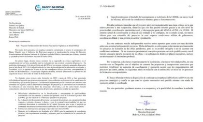 Sin embargo, no es el único cuestionamiento que reposa sobre el nuevo ministro de Salud, Juan Carlos Velasco. COSAS accedió a una carta enviada por el Banco Mundial al despacho del extitular del sector, Luis Quiroz, en el que se advertía sobre varias observaciones sobre la gestión del proyecto “Fortalecimiento del Sistema Nacional de Vigilancia en Salud Pública”.