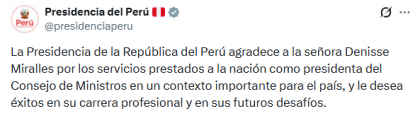 «La Presidencia de la República del Perú agradece a la señora Denisse Miralles por los servicios prestados a la nación como presidenta del Consejo de Ministros en un contexto importante para el país, y le desea éxitos en su carrera profesional y en sus futuros desafíos», es lo que se observa en las redes institucionales.