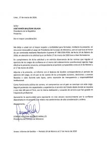 La misiva de la saliente jefa de gabinete adjunta un informe de balance de las acciones tomadas durante este breve periodo en la PCM.