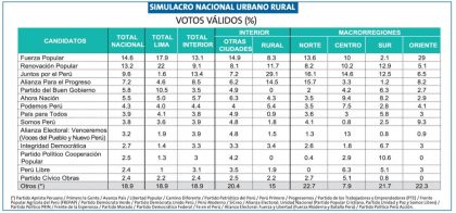 De otro lado, el simulacro de IPSOS Perú muestra que País para Todos, Podemos Perú, la alianza Venceremos, Cooperación Popular, Perú Libre, Apra, entre otros, no llegan a superar la valla.