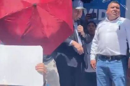 La policía estableció un cordón de seguridad con escudos y paraguas, pero no logró impedir los lanzamientos desde un sector ubicado a varios metros del estrado. El líder de Renovación no dudó en reaccionar ante el ataque.