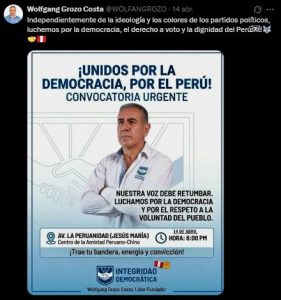 «Independientemente de la ideología y los colores de los partidos políticos, luchemos por la democracia, el derecho a voto y la dignidad del Perú», escribió el líder del partido Integridad Democrática que perderá la inscripción en enero del 2027 y desaparecerá el tablero político.