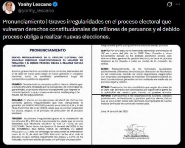 Yonhy Lescano, excongresista y que tentó la presidencia con Cooperación Popular, también se sumó a los cuestionamientos contra la ONPE y el JNE. «Graves irregularidades en el proceso electoral que vulneran derechos constitucionales de millones de peruanos y el debido proceso obliga a realizar nuevas elecciones», escribió. Al igual que los otros dos casos, el exintegrante de Acción Popular sacó 204 mil votos, lo que es 1,30%.