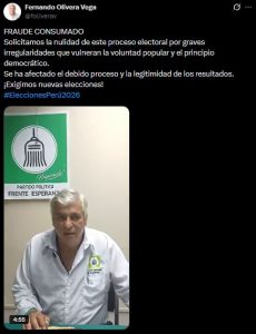 En esa cruzada también se ha sumado Fernando Olivera, líder del Partido Frente de la Esperanza, quien colocó en sus redes el siguiente mensaje: «Solicitamos la nulidad de este proceso electoral por graves irregularidades que vulneran la voluntad popular y el principio democrático. Se ha afectado el debido proceso y la legitimidad de los resultados. ¡Exigimos nuevas elecciones! «.