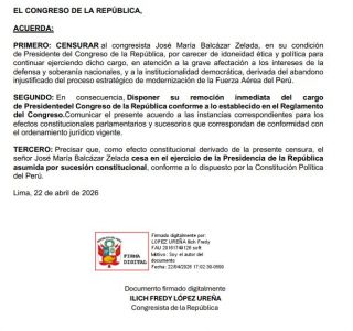 «La permanencia del señor José María Balcázar Zelada en la Presidencia del Congreso resulta incompatible con las exigencias éticas y políticas del cargo, más aún cuando sus decisiones y actuaciones tienen impacto directo en la conducción transitoria del Poder Ejecutivo, lo que agrava la afectación institucional y justifica plenamente la presente moción de censura», menciona.