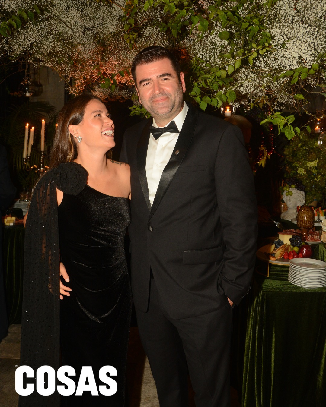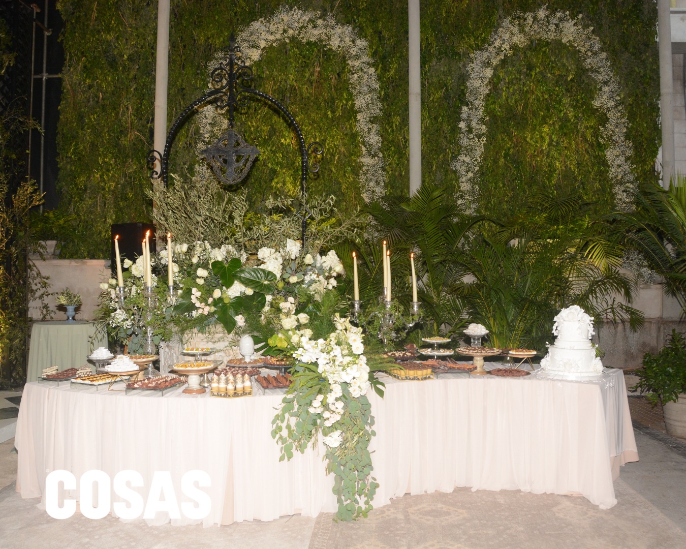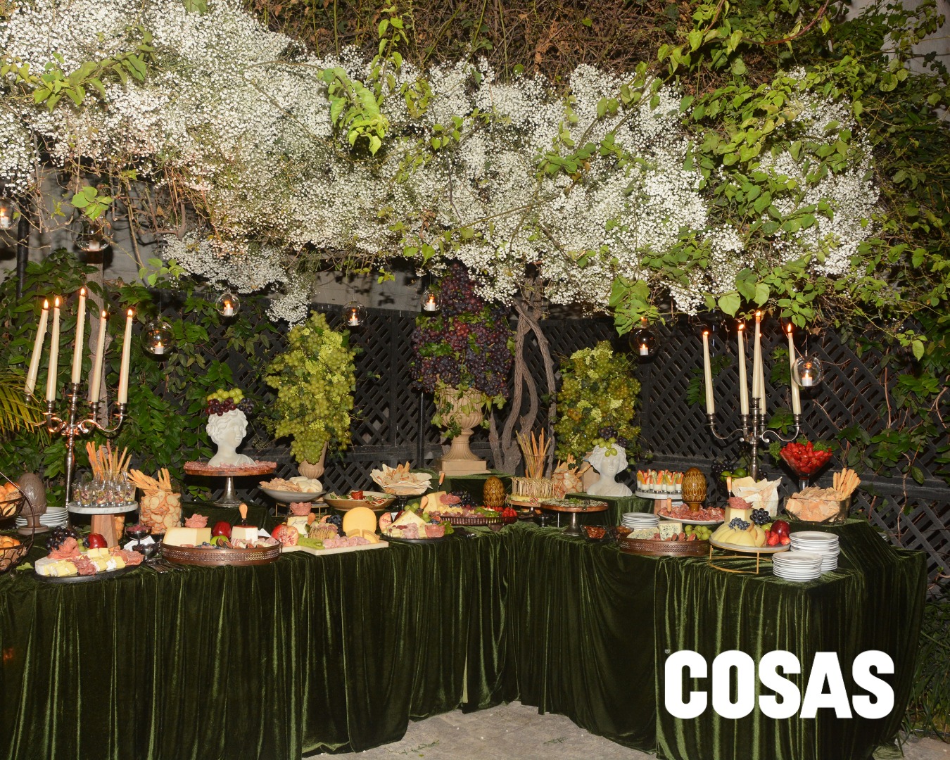 Bajo una atmósfera envolvente de flores, follaje y velas colgantes, una mesa de inspiración clásica destacó con variedad de quesos, embutidos, frutas y panes artesanales.