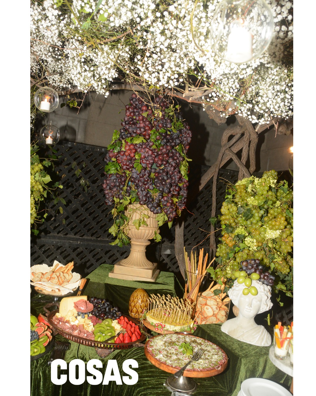 Una mesa decorada con racimos de uvas y flores, acompañó la celebración con una selección de quesos, embutidos y frutas frescas.