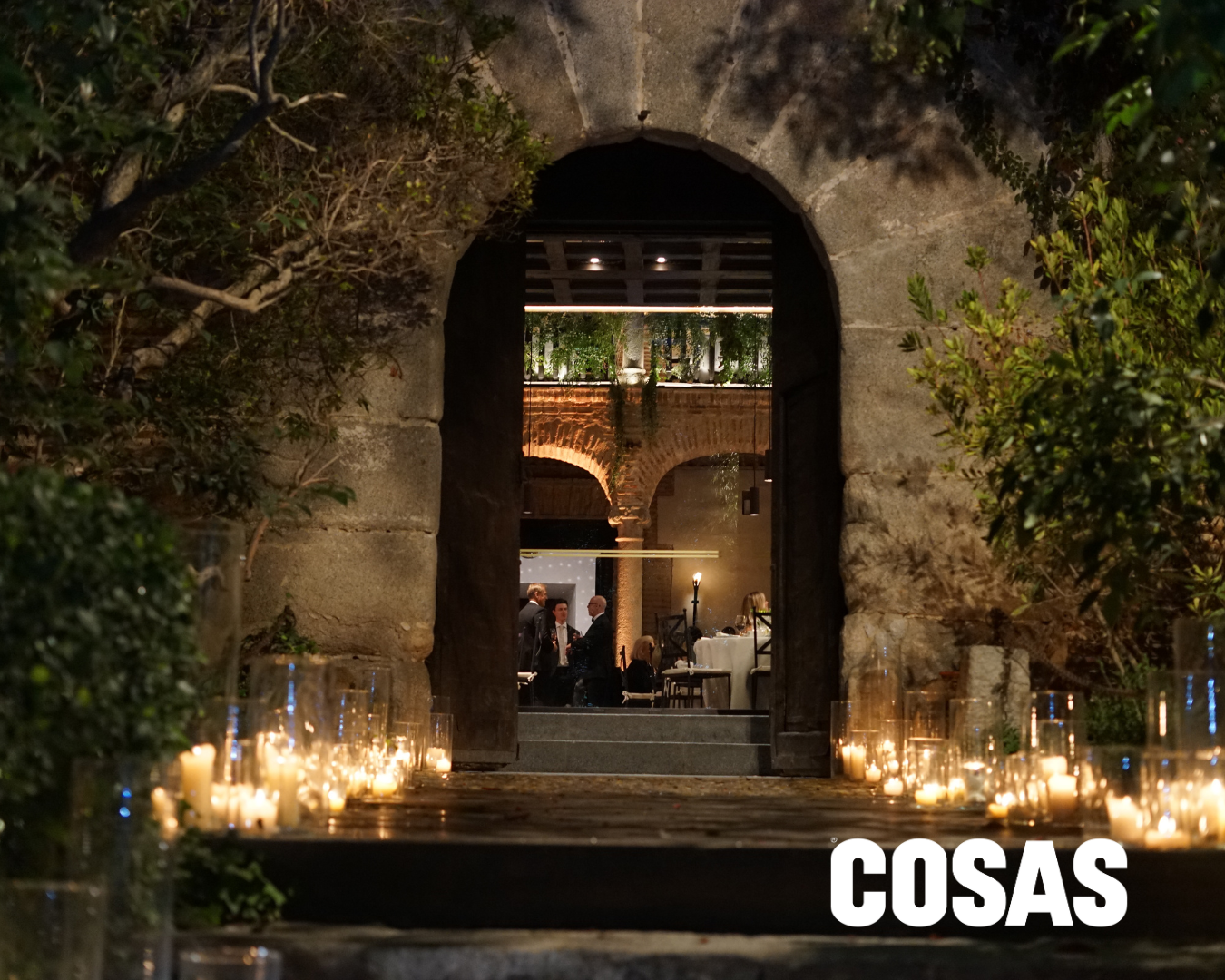 El acceso al recinto, iluminado por velas, anticipa una atmósfera íntima y ceremonial.