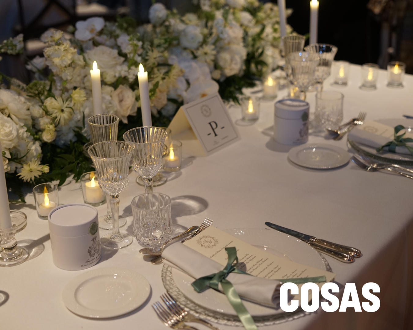 Una mesa vestida de blanco,con velas, cristalería y flores claras, pensada para una cena sobria y elegante.