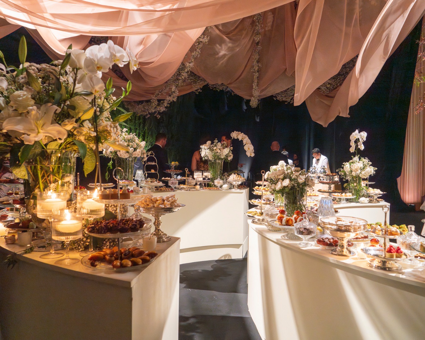 Mesa de dulces sobre pedestales blancos, con repostería presentada en piezas de cristal, arreglos florales claros y velas.