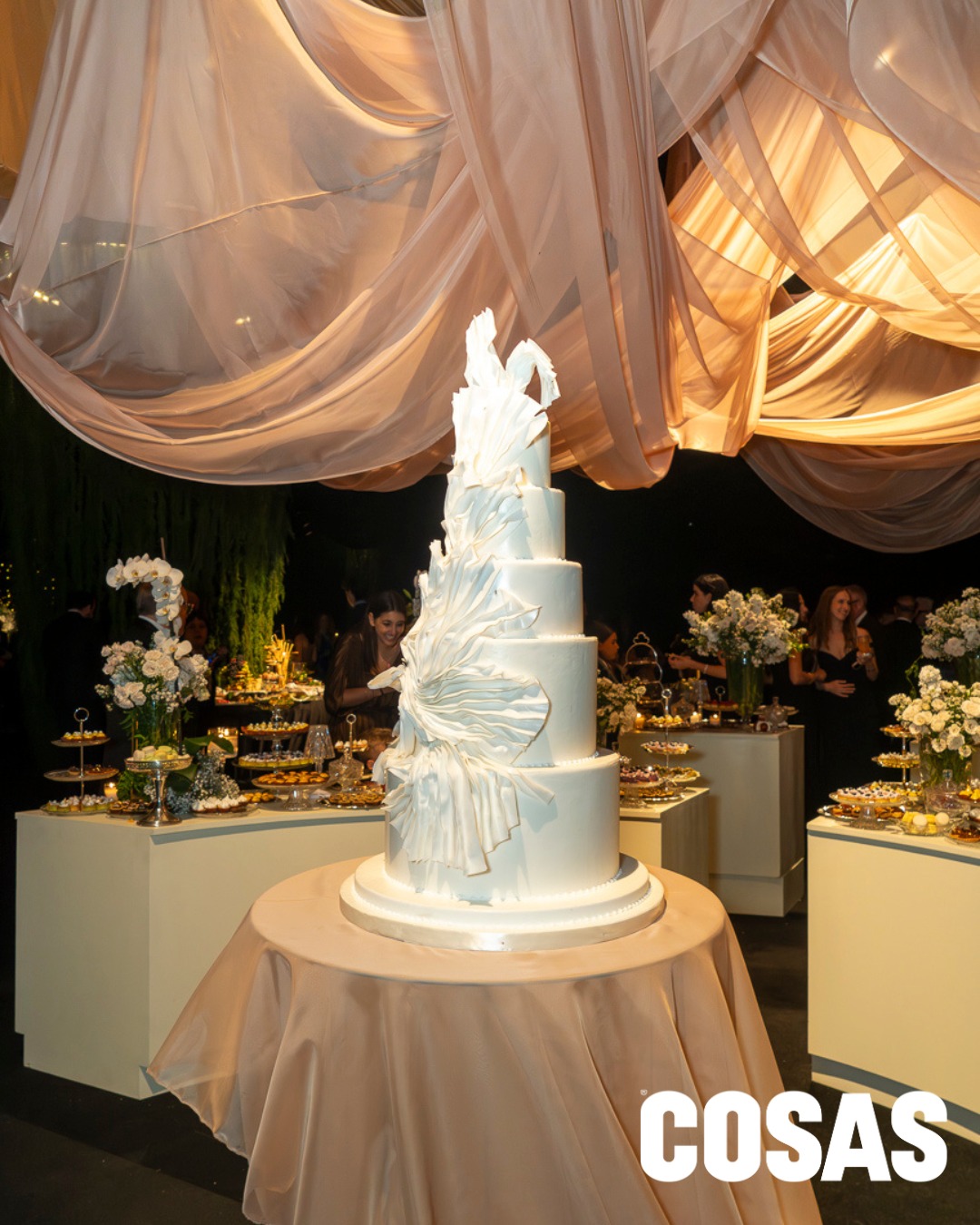 Pastel blanco de varios niveles con diseño escultórico inspirado en pliegues.