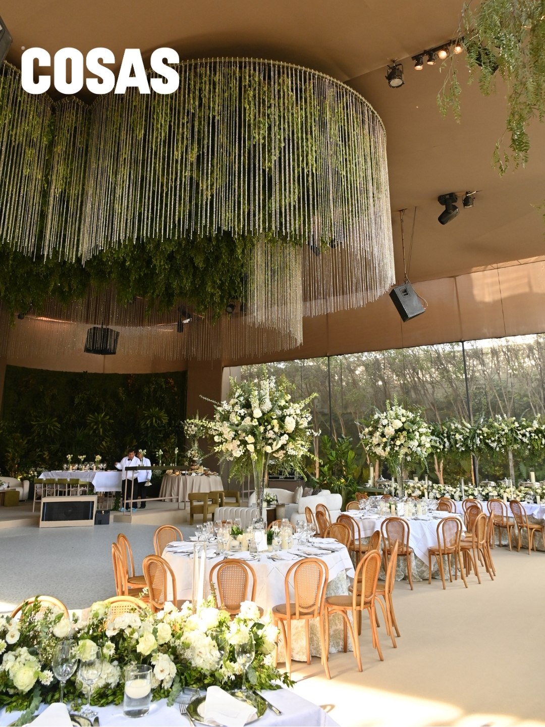 La decoración orgánica y luminosa incluía guirnaldas colgantes, follaje abundante y centros florales blancos sobre mantelería neutra.