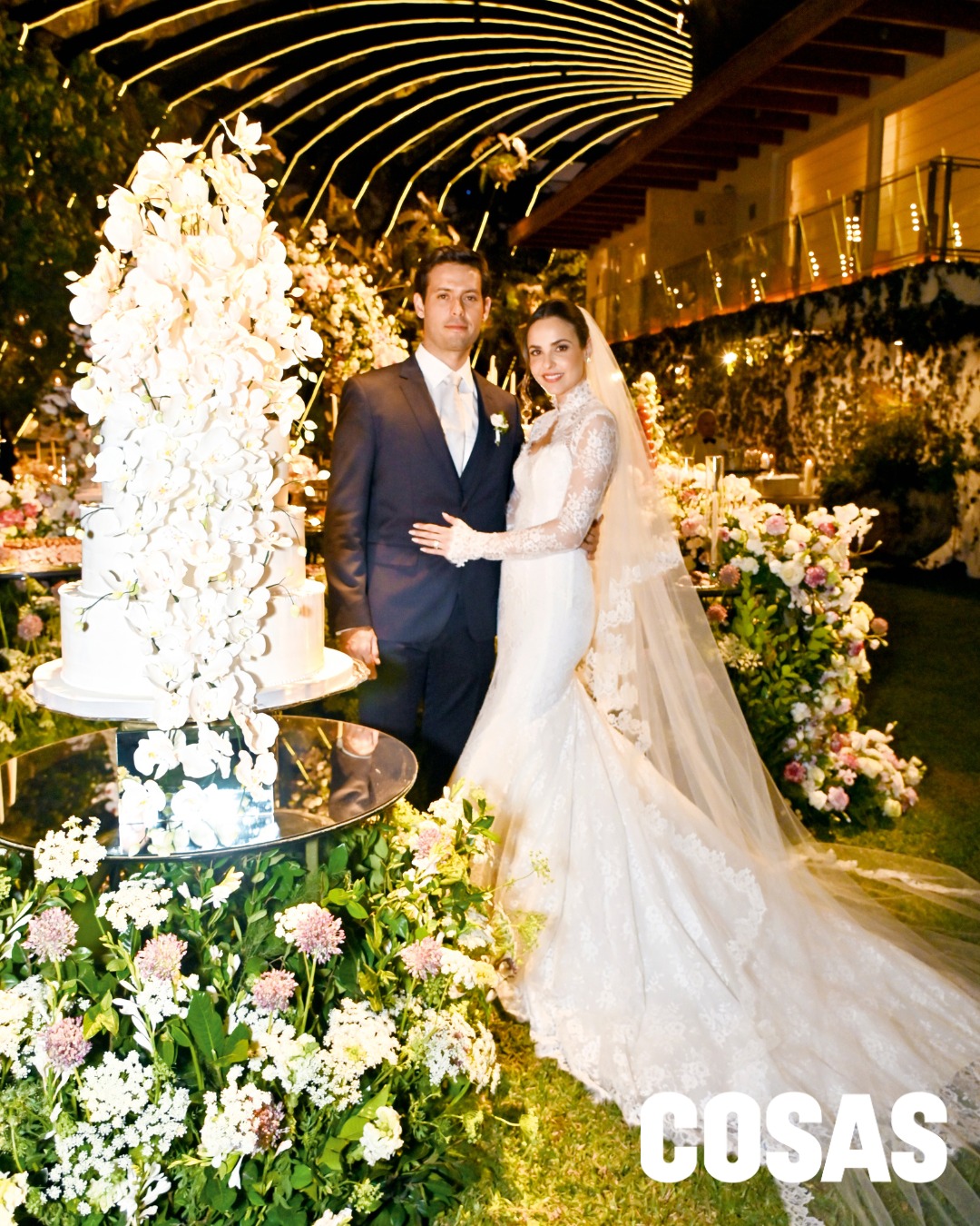 Con producción de Alexandra Ruiz Bravo, la recepción destacó por lámparas de bronce con follaje y luz cálida. La mesa de dulces tuvo torta blanca de cinco pisos. La fiesta siguió con Bacanos en vivo. La luna de miel recorrerá Madrid y un crucero por Grecia e Italia.